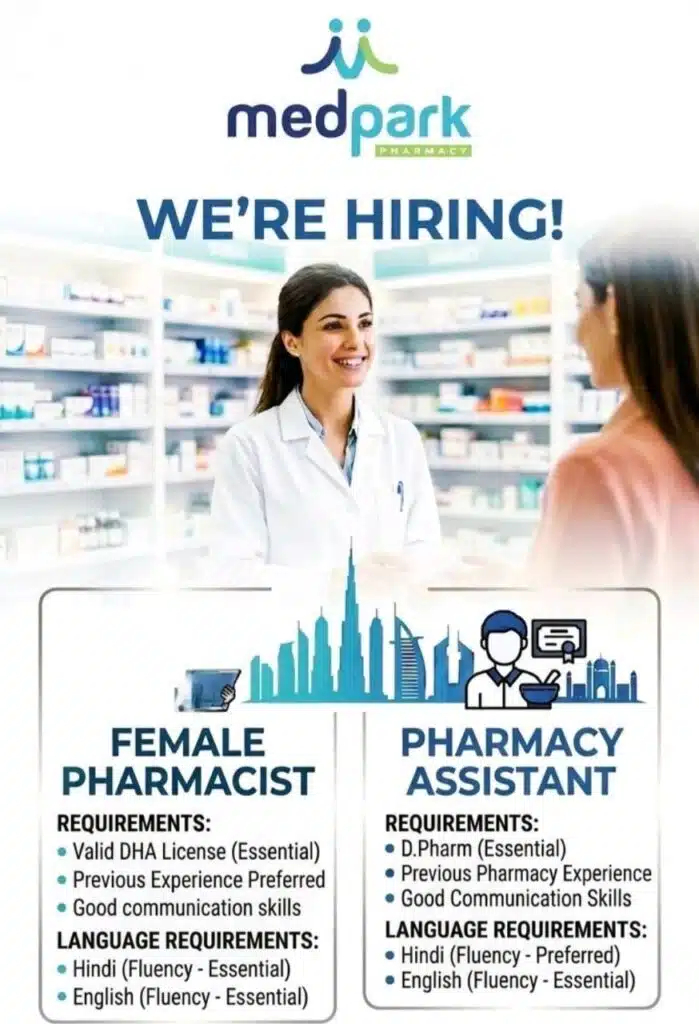 If you’re a female pharmacist or a pharmacy assistant looking for a job in Dubai, here’s a fresh opportunity. Medpark Pharmacy is currently hiring, and the requirements are clear – valid DHA license, fluency in Hindi and English, and strong communication skills.