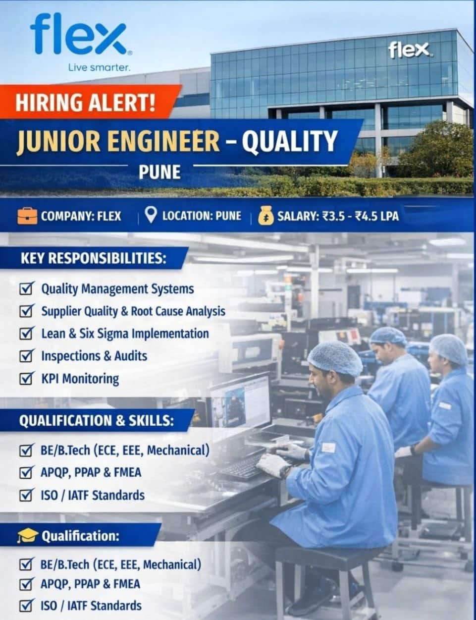 If you’re a fresh BE/B.Tech graduate in ECE, EEE, or Mechanical, and looking for a quality engineering role in Pune, here’s a solid opportunity. Flex is hiring for Junior Engineer – Quality with a salary range of ₹3.5–4.5 LPA. The role is perfect for candidates with 0–2 years of experience who want to build a career in Quality Management Systems, Lean Six Sigma, and supplier quality.