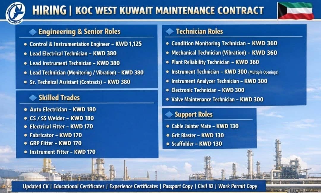 All these roles are based in West Kuwait under the KOC maintenance contract. Below is the complete list of job titles and their location – no extra fluff, just what’s being offered.
