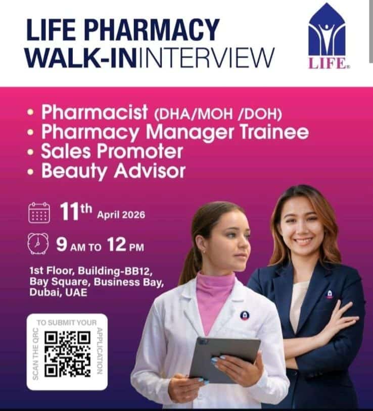 Looking for a pharmacy job in Dubai? Life Pharmacy is hosting a walk-in interview on 11th April 2026 at their Bay Square location in Business Bay. If you’re a passionate professional ready to grow your career in the UAE healthcare retail sector, this is your chance.