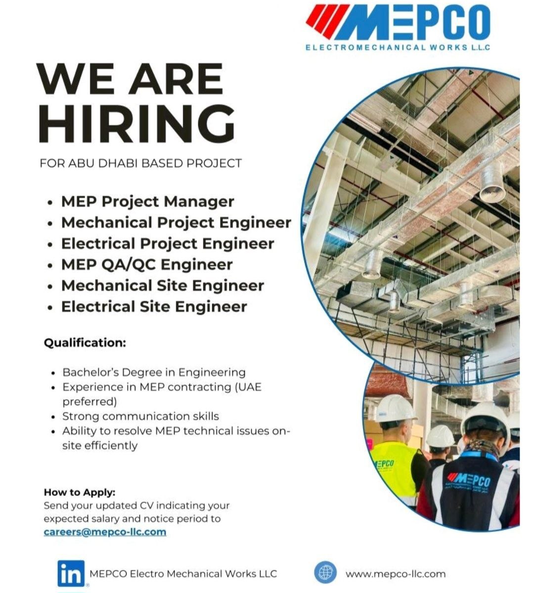 If you’re an MEP professional looking for a role in Abu Dhabi, here’s a solid opportunity. MEPCO Electro Mechanical Works LLC has announced multiple vacancies for an upcoming Abu Dhabi-based project.