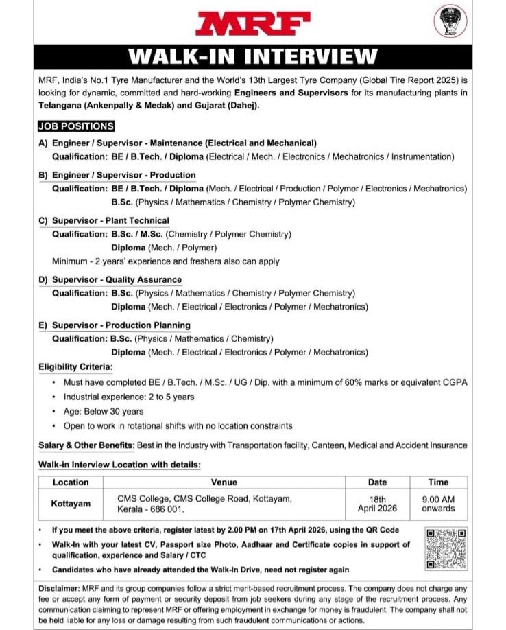 Disclaimer: This article is based on the official MRF walk-in interview notification. MRF and its group companies do not charge any fee for recruitment. The company is not responsible for any fraudulent offers demanding money.