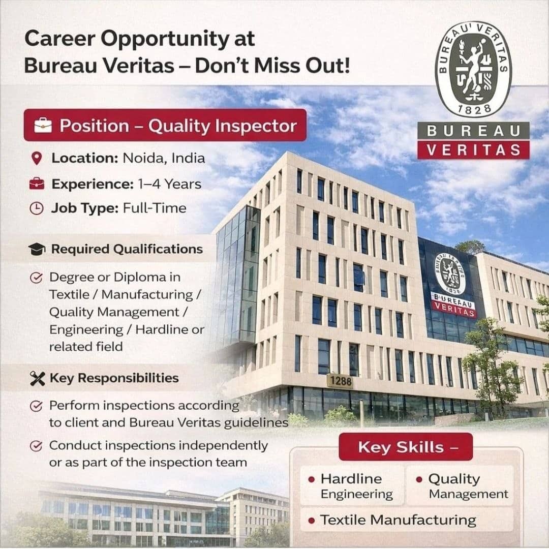 If you have 2+ years of quality inspection experience and live in or near Noida, this Bureau Veritas opening is worth applying for. The role is focused on audits, ISO standards, and reporting – so highlight those skills in your resume.