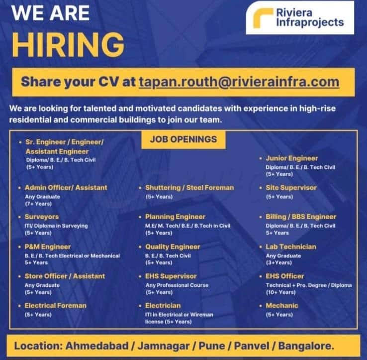 Riviera Infraprojects If you’re a civil engineer, site supervisor, foreman, or surveyor looking for a stable job in top Indian cities, here’s a great opportunity. Riviera Infraprojects is currently hiring for high-rise residential and commercial building projects across Ahmedabad, Jamnagar, Pune, Panvel, and Bangalore.