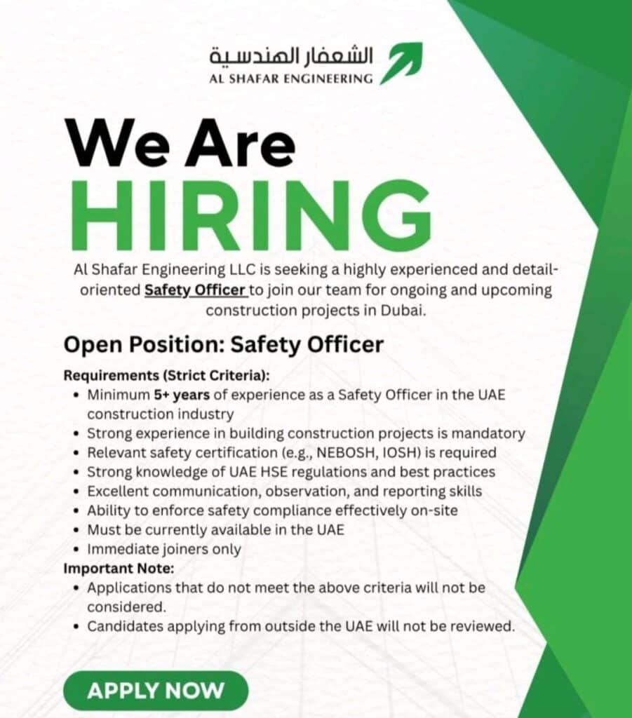 If you’re a seasoned safety professional currently based in the UAE and looking for your next challenge, here’s an opportunity worth your attention. Al Shafar Engineering LLC has just announced an urgent opening for a Safety Officer to work on building construction projects across Dubai.