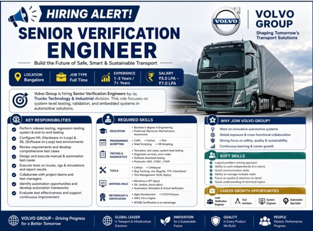 If you’re an embedded systems tester looking for a role in the automotive industry, Volvo Group has just opened a Senior Verification Engineer position at its Trucks Technology division in Bangalore. And here’s the interesting part – they are hiring both early-career (1–3 years) and senior-level (7+ years) candidates for the same role.