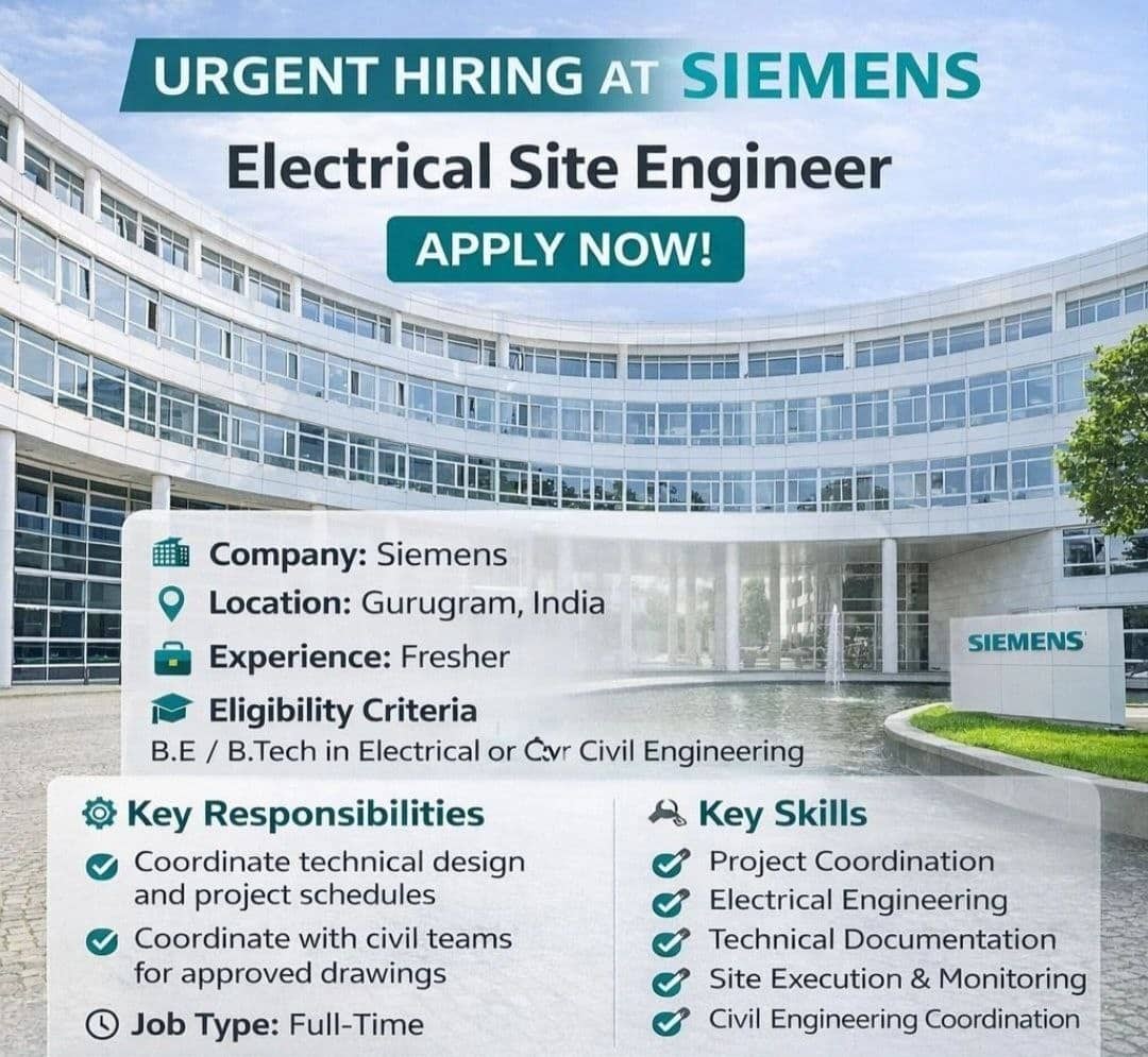 If you’re an engineering graduate looking for a big break, here’s some exciting news. Siemens has just announced an urgent hiring drive for the position of Electrical Site Engineer at its Gurugram location. The best part? Freshers are welcome to apply.