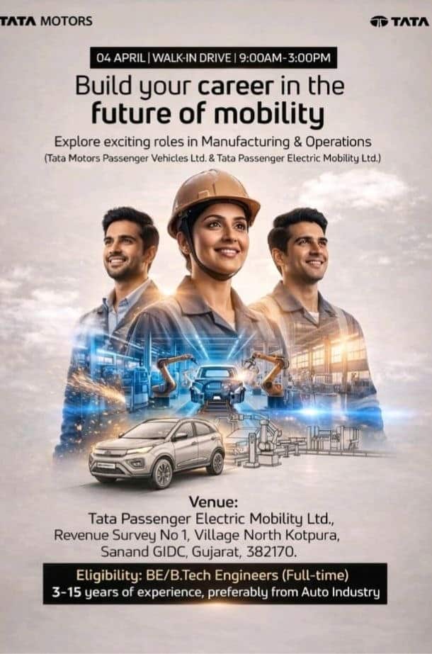 Tata Motors If you’re an engineer looking to build your career in the future of mobility, here’s a great opportunity. Tata Motors is conducting a walk-in drive for its Passenger Vehicles and Electric Mobility divisions in Gujarat. The event is scheduled for April 4th, 2026 (Saturday) from 9:00 AM to 3:00 PM.