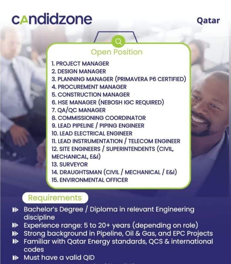 Candidzone is actively hiring for 15+ engineering and management roles. If you have experience in oil & gas, pipeline projects, or construction management, this is your chance to work in Qatar’s energy sector.