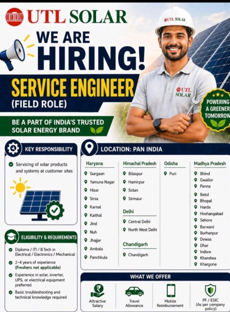 If you’re an experienced electrical or electronics professional looking for a field job in the solar energy sector, here’s a great opportunity. UTL Solar, one of India’s most trusted solar brands, is hiring Service Engineers for a field role across multiple states. Below is everything you need to know – from job locations to eligibility, application process, and FAQs.