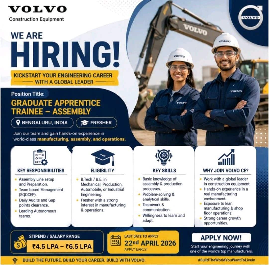 If you’re a fresh engineering graduate looking to get your foot in the door of a global manufacturing giant, here’s a solid opportunity. Volvo Construction Equipment (Volvo CE) is hiring Graduate Apprentice Trainees – Assembly for their Bengaluru facility. The role offers hands-on shop floor experience, a competitive stipend, and a chance to grow with a world-class brand.