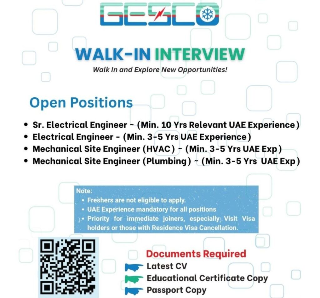 If you’re an experienced engineering professional in the UAE, here’s a solid opportunity you don’t want to miss. GECL (Ginoo Electrical & Sanitary Co.) is conducting a walk-in interview from 27 April to 2 May 2026 at their GCC Site Office in Dubai. They’re looking for skilled Electrical and Mechanical Site Engineers with mandatory UAE experience.