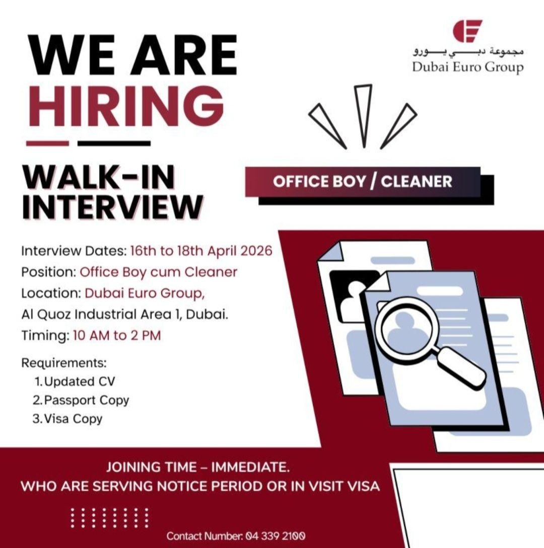 If you are in Dubai and looking for an immediate joining opportunity, here is a solid chance. Dubai Euro Group is hiring an Office Boy cum Cleaner through a walk-in interview. This is a great role for those on a visit visa or currently serving a notice period.